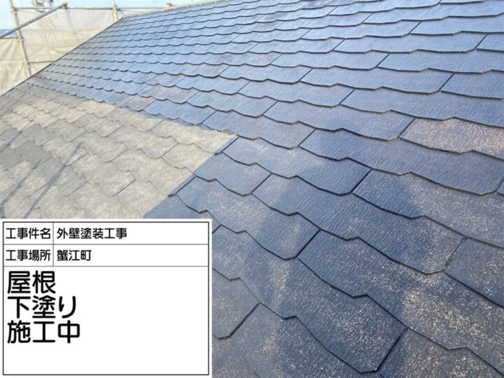 屋根全体に下塗り「KFマイルドシーラーⅡ」を塗布しています。下塗りは塗装の密着性を高め、上塗りの仕上がりを均一にする重要な工程です。刷毛やローラーで丁寧に塗りムラを防ぎながら塗布しており、写真では均一に広がる塗膜の様子が確認できます。この工程により、屋根材の保護性能が向上し、次の上塗り工程への準備が整いました。