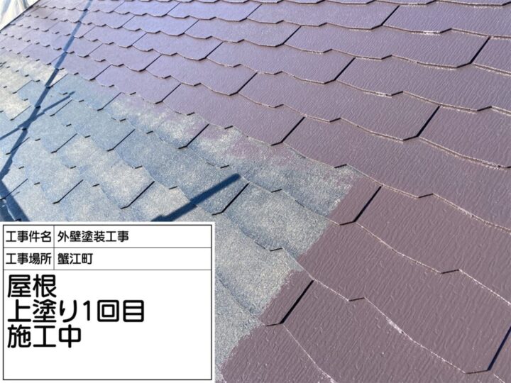 下塗りの乾燥後、上塗り1回目として「セミフロンスーパールーフⅡ」を塗布しています。屋根全体に均一に塗装することで、耐候性や美観の向上が期待できます。ローラーや刷毛を使い、塗りムラや重ね塗りの不足がないよう注意しながら施工中です。写真では鮮やかに色がのり始めた屋根の様子が確認でき、2回目上塗りに向けた準備が整っている状態です。