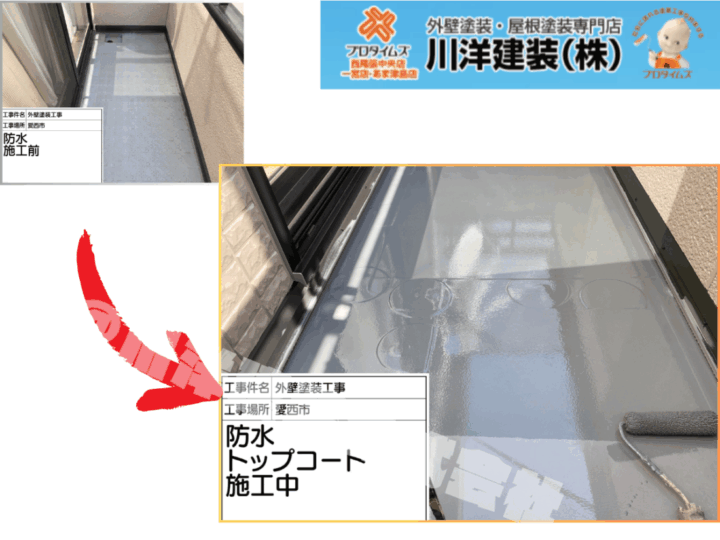ベランダ防水の最終工程、トップコート塗装です。既存の防水層を紫外線による劣化から守り、防水機能を維持させるための「保護膜」を形成します。防水面は雨や歩行による摩耗など負担が大きい場所ですが、専用のトップコートを均一に塗布することで、滑らかで水はけの良い床面が蘇ります。雨漏りから住まいを守る最後の砦として、細心の注意を払いながら、美しく機能的な仕上がりを実現させていきます。