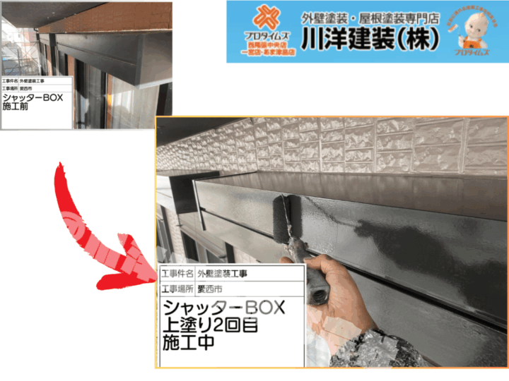 シャッターボックスの仕上げ塗装です。金属部は錆が発生しやすいため、適切な下地処理を施した上で、2回目の上塗りを丁寧に行い、強固な防食性能を与えます。塗り重ねることで表面が滑らかになり、美観が向上するだけでなく、汚れも付きにくくなります。細かな段差や端の部分まで職人の手で均一にコーティングし、外部環境から守るバリアを形成します。美しさと機能性を両立させる大切な作業です。