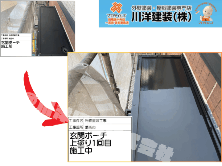 玄関ポーチの屋根塗装(上塗り1回目)を行っています。住まいの顔である玄関先を美しく、かつ強固に守るため、遮熱性や耐候性に優れた塗料を使用して丁寧に色を乗せていきます。屋根面は直射日光を強く受けるため、1層目から厚みを意識して塗装し、基材を確実に保護します。ここを綺麗に仕上げることで、来客時の第一印象を大きく向上させるとともに、建物全体の耐久バランスを整えていきます。